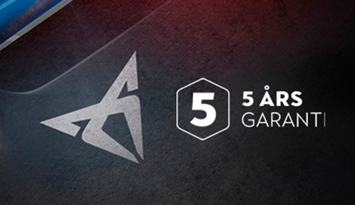 ****Samlet garanti i 5 år/150.000 km ved materiale- og fabrikationsfejl på batterielektriske biler (BEV) solgt af CUPRA Danmark til en af CUPRA Danmarks autoriserede forhandlere og udleveret af denne forhandler. De første 2 år dækkes af fabrikantens garanti, de næste 3 år dækkes af CUPRA Danmark igennem vores autoriserede servicepartnere i Danmark, Grønland og på Færøerne. Garantien omfatter ikke Plugin Hybrider (PHEV), digitale tjenester og services, indefra kommende gennemtæring, eftermonteret udstyr, naturligt slid eller sliddele, lak, højvoltsbatteri eller vejhjælp. Se øvrige vilkår og begrænsninger på cupra.dk/garanti eller her.